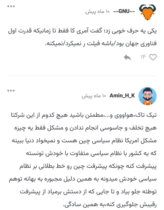 تیک تاک،هواووی و…،مطمئن باشید هیچ کدوم از این شرکتا هیچ تخلف و جاسوسی انجام ندادن و مشکل فقط یه چیزه مشکل امریکا نظام سیاسی چین هست و نمیخواد دنیا ببینه که یه کشور با نظام سیاسی متفاوت با خودش تونسته پیشرفت کنه چونکه پیشرفت چین رو خط بطلانی بر نظام سیاسی خودش میدونه به همین دلیل مجبوره به بهانه توهم توطئه جلو بیاد و تا جایی که از دستش برمیاد از پیشرفت رقیبش جلوگیری کنه،به همین سادگی.