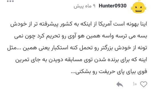اینا بهونه است آمریکا از اینکه به کشور پیشرفته تر از خودش بسه می ترسه واسه همین هو آوی رو تحریم کرد چون نمی تونه از خودش بزرگتر رو تحمل کنه استکبار یعنی همین …مثل اینه که برای برنده شدن توی مسابقه دویدن به جای تمرین فوی بیای پای حریفت رو بشکنی…