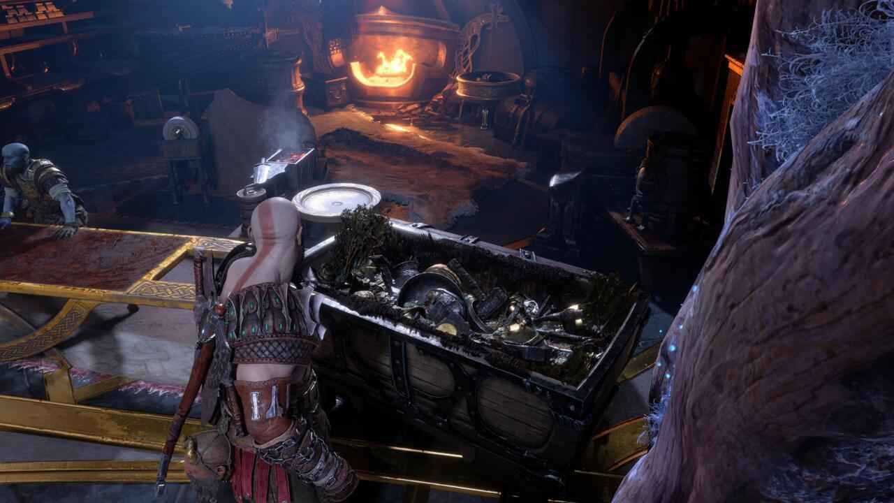 وقتی دروازه را ترک کردید و وارد نقشه شدید، به سمت چپ حرکت کنید تا به یک کمپ کوچک برسید. در حالی که رو به کمپ هستید، به راست بپیچید و کلاغ اودین را خواهید دید که بر بالای یک سنگ آتشفشانی نشسته است. آن را با تبر لویاتان خلاص کنید.