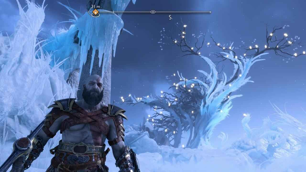 در عوض، سورتمه خود را در سمت چپ معبد، نزدیک دروازه منتهی به نیمه دیگر آلفهایم پارک کنید (منطقهای که در اولین سفر نمیتوانید آن را باز کنید). شما متوجه یک درخت مرده خواهید شد که از کنار یک صخره بیرون زده است – و روی تنه، یکی از کلاغهای اودین قرار دارد. دخل او را بیاورید.